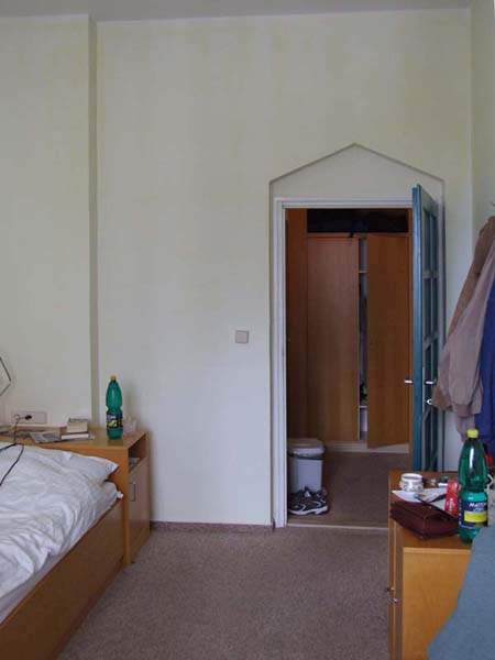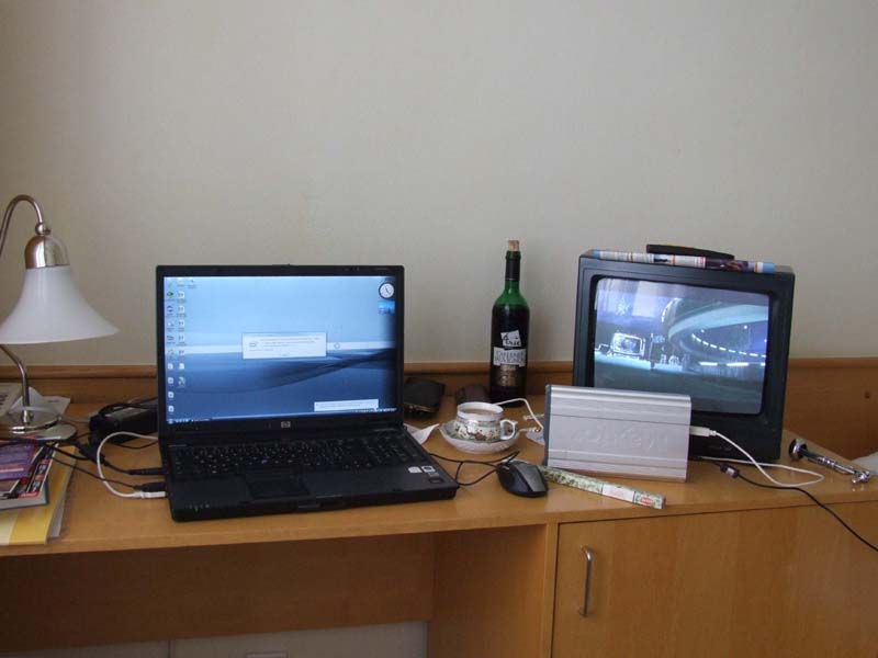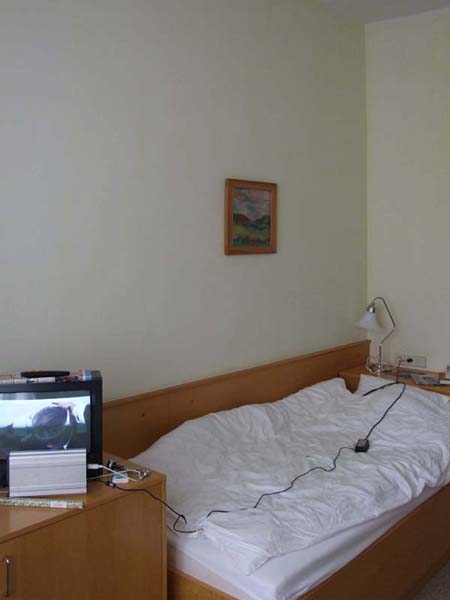 Takhle vypadá moje cimra. To na stole je samozřejmě notebook s příslušenstvím: