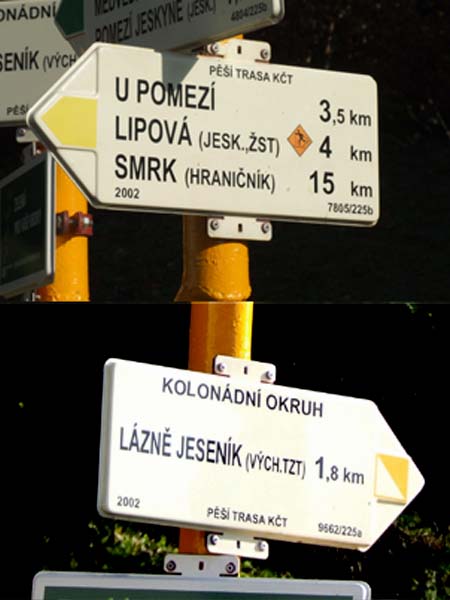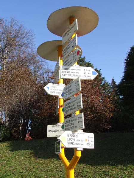 Chodím na procházky tak jak mě co kam vede. Do toho by se měl vnést řád. A chodit po značkách. Vybral jsem si lehký okruh, alespoň to tvrdí prospekt. Téměř po rovině. Chvíli mě mátlo množství ukazatelů, ale nejsem přece barvoslepý. Po hodině cestou necestou nahoru dolu začínám pochybovat. Kam ty značky vedou? Barva souhlasí. Ale nejsou nějaké jiné? Jo tak, to nejsou lázeňské značky, to jsou turistické značky! Tudy je to pro zdatné turisty, lázeňská promenáda je asi úplně jinde. Takže zpět. Raději se nechám džípíeskovat Gertrudou. Lázeňské značky už dnes hledat nebudu. Stmívá se.