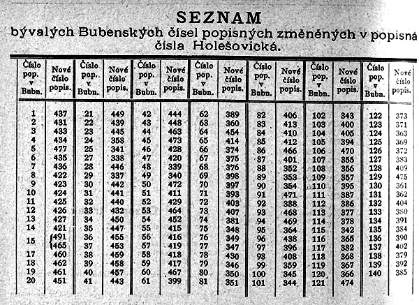 Obce Holešovice a Bubny se v roce 1850 spojily a vytvořily obec Holešovice-Bubny. Ta se pak koncem roku 1884 připojila k Praze jako VII. městská část. Holešovice-Bubny byly dvě spojené katastrální obce, takže dům číslo 1 byl jak v Bubnech, tak v Holešovicích. To ovšem neodpovídalo tehdejší pražské praxi, kde domy byly domy číslovány v rámci jednotlivých městských částí. Hned v roce 1885 byly proto domy v Bubnech přečíslovány. Následující tabulka převádí původní bubenská čísla popisná na nová holešovická.