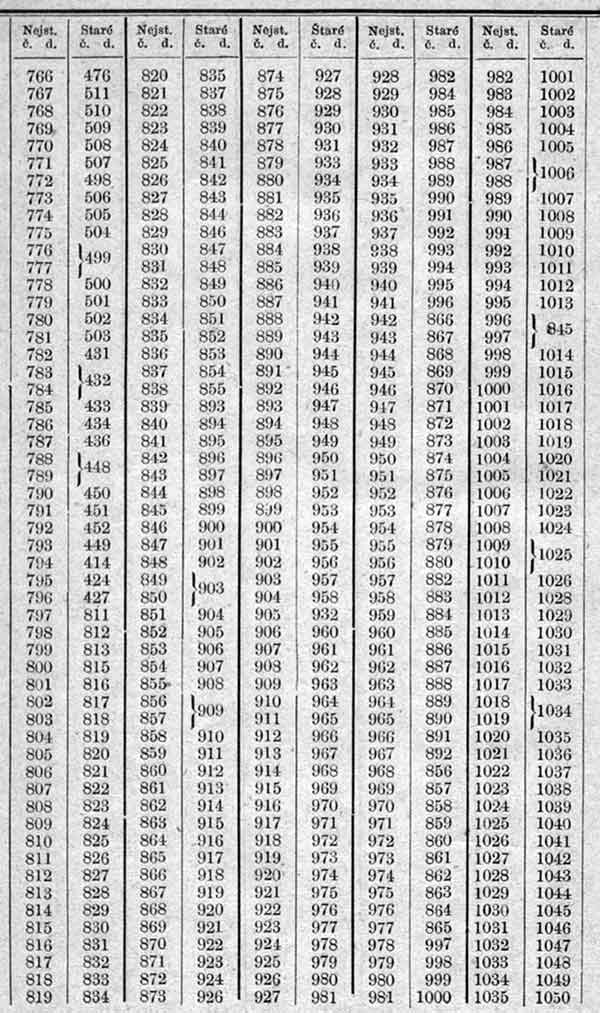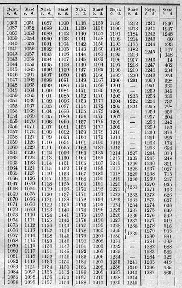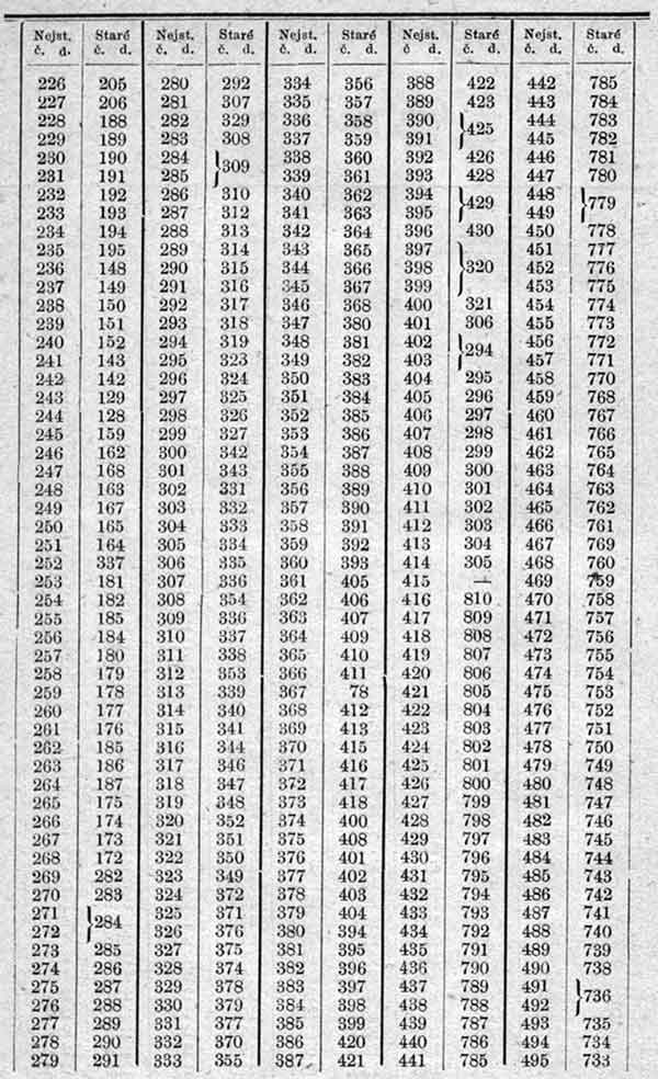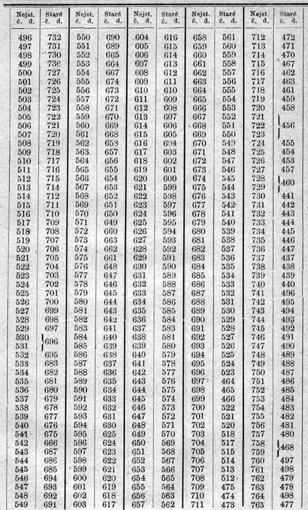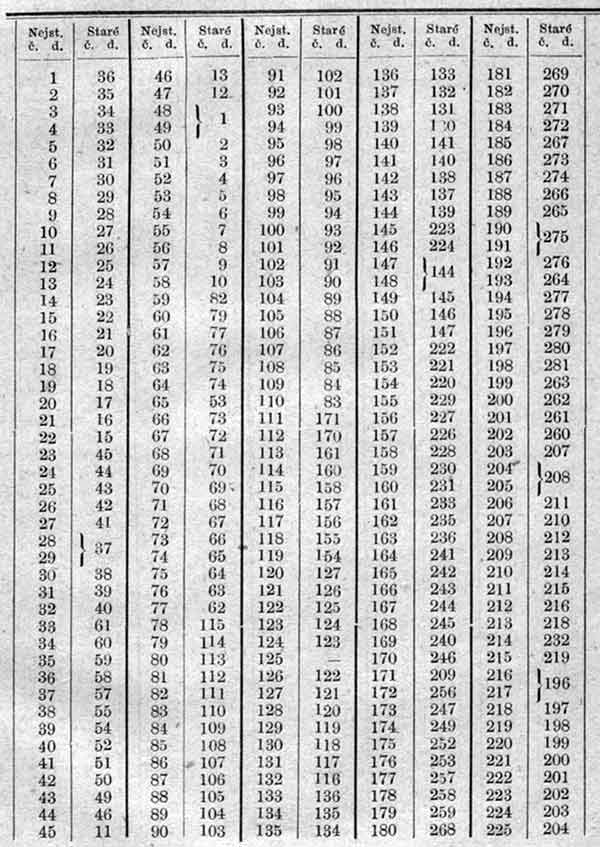 Převodní tabulka porovnává čísla domů z roku 1770 (v tabulce uváděna jako nejstarší) a z přečíslování v roce 1805 (označena jako stará čísla, dnes je známe jako čísla popisná a jsou na červených tabulkách). Za nová čísla v té době označovali ta číslo, kterým nyní říkáme orientační - číslování domů v rámci jedné ulice (modré tabulky).