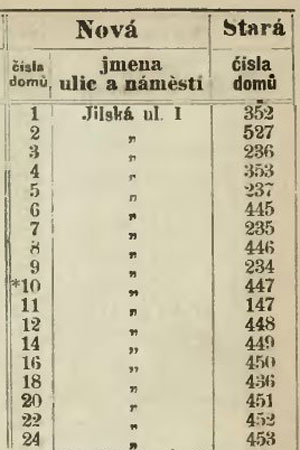 V roce 1802 došlo v tehdejší Praze k přečíslování domů. Od té doby se často užívalo označení staré číslo a nové číslo. Aby to ale nebylo tak jednoduché, v roce 1869 byly domy znova očíslovány a opět se začalo používat označení staré číslo a nové číslo, ale občas se objevoval i pojem nejstarší číslo.