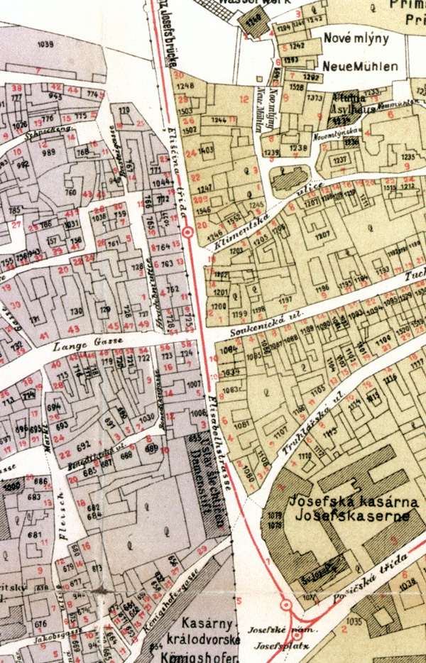 | 1891 | | Eliščina třída / Elisabethstrasse | | Hurtigův plán Prahy, 1891 |