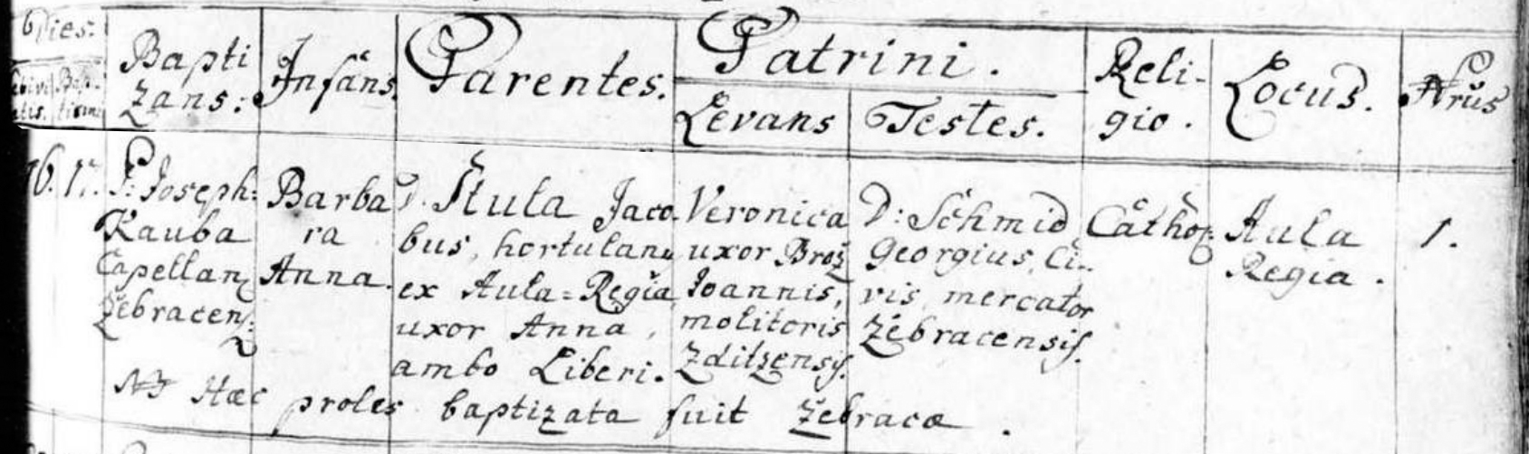 | Hoc proles baptizata fuit Žebraco.[Tímto bylo dítě pokřtěno v Žebráku.] |