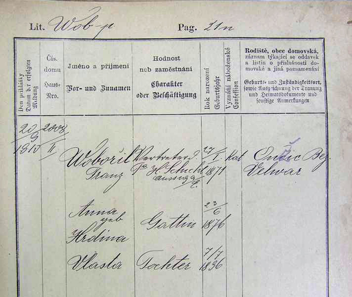 NEZPRACOVÁNO Wobořil Franz (1871) Wobořil (Hrdina) Anna (1876) Wobořil Vlasta (1896)