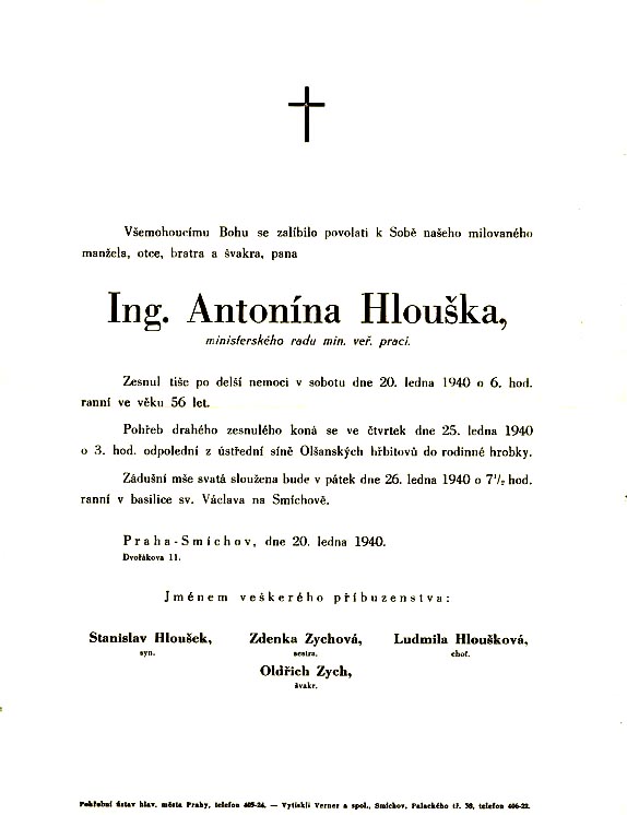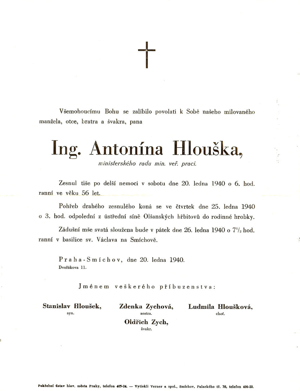 Povolání: Ministerský rada Narození: Holešovice VazbyOTEC: František Hloušek, *1848 MATKA: Antonie Hloušková (Šoulejova), *1863 MANŽELKA: Ludmila Hloušková (Kubešová), *1887 DCERA: SYN: Stanislav Hloušek, *1912 PoznamkyNar. matrika 'BBČ N23 • 1877-1884 • Velké Holešovice, str 412' Úmrtní list, N.E. 809, Arciděkanský úřad v Praze-Smíchov 1940 fol. 100 Dom. list 8.11 1899 č. 5247, 29.12.1909 č. 1736 BádáníVěstník SIA, Ročník 1/1933, str 123: Ing. Antonín Hloušek, vrchní odb. rada ministerstva veř. prací, padesátníkem.