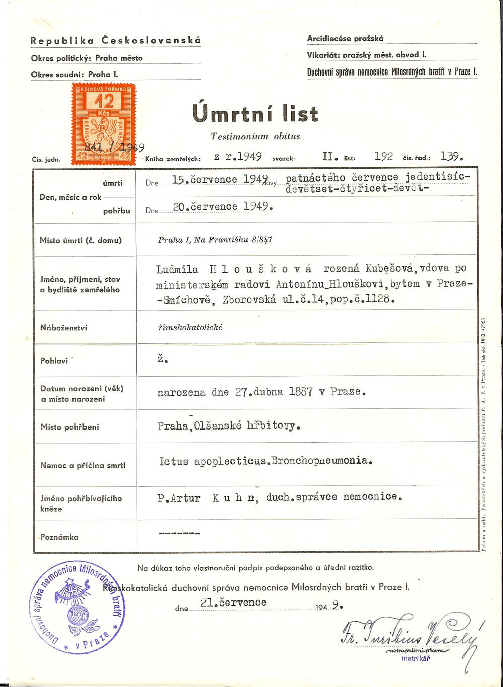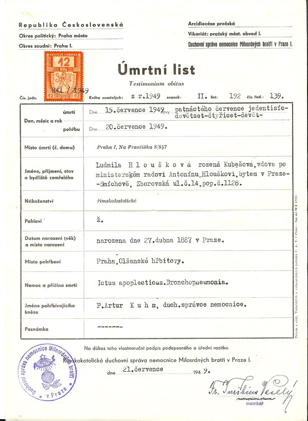 OTEC: MATKA: MANŽEL: Antonin Hloušek, *1883 SYN: Stanislav Hloušek, *1912 DCERA: