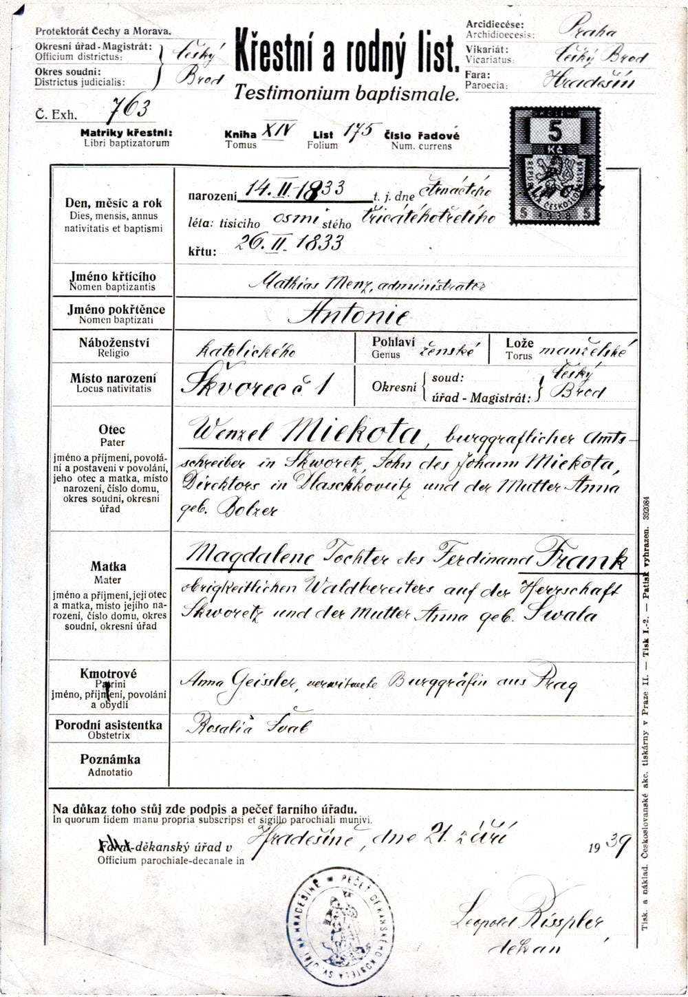 - 14.2.1833 -- Narozena v Škvorec č.1